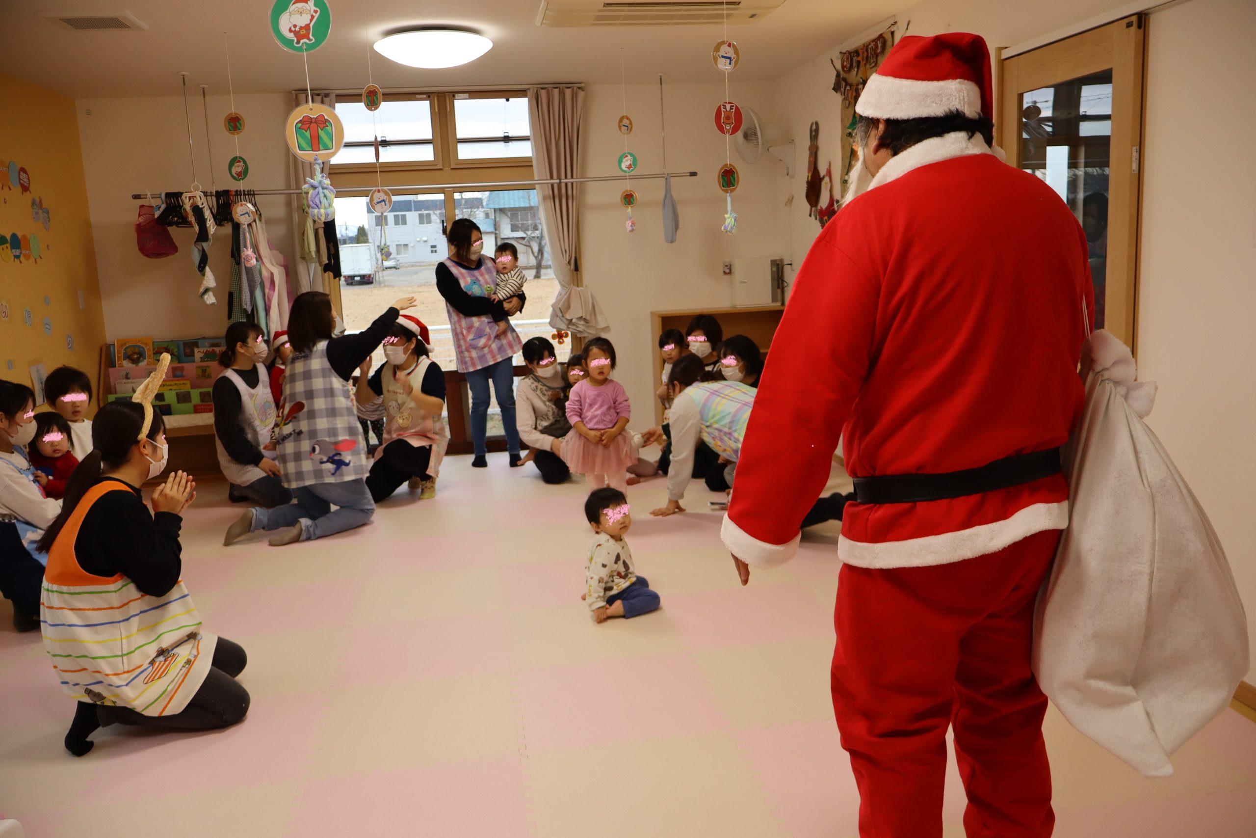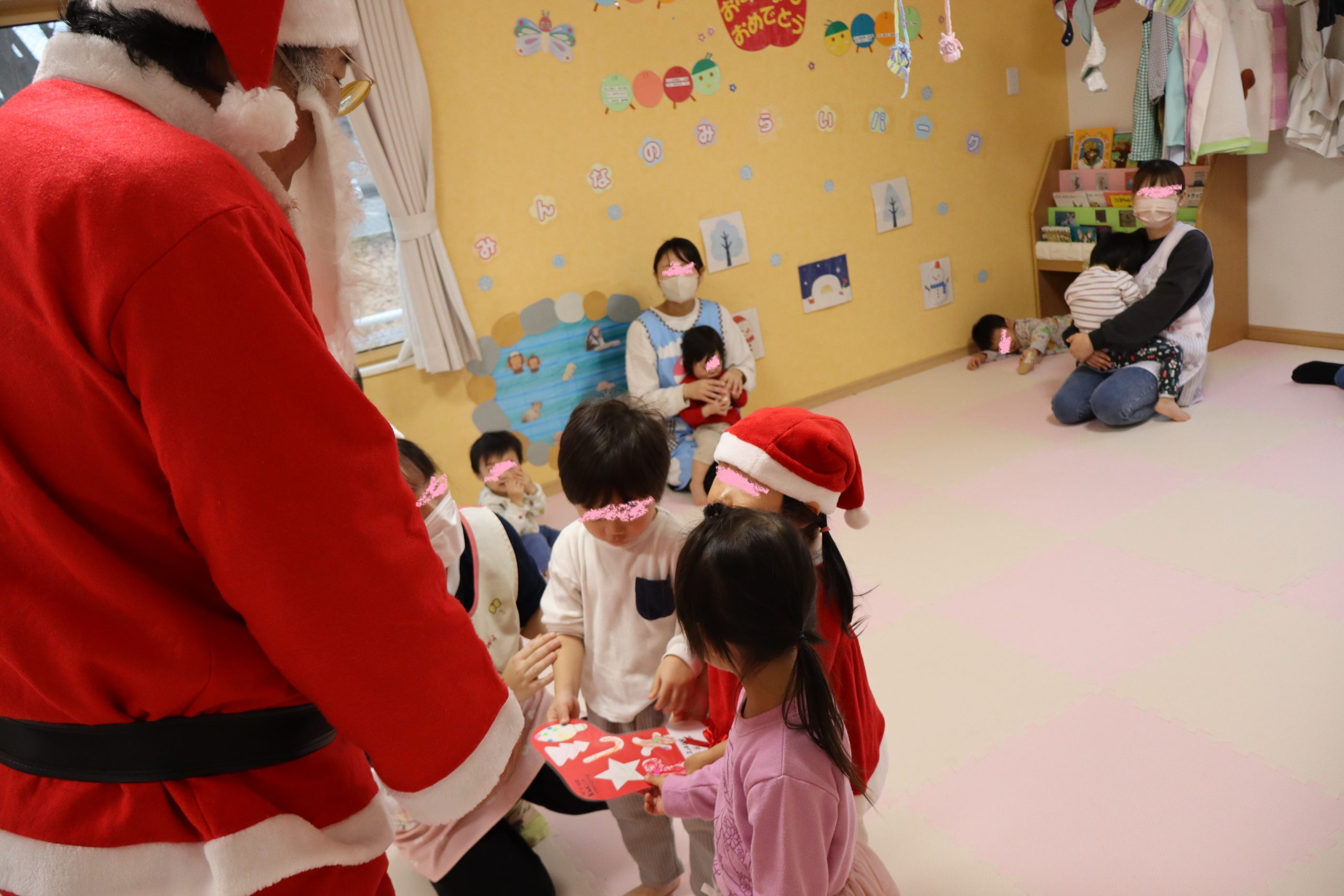 担いでいる大きな袋からプレゼントが渡され、ひとりずつサンタさんへ「ありがとう!」としっかりお礼を伝え大切そうにプレゼントを受け取っていました。中身は何かな?